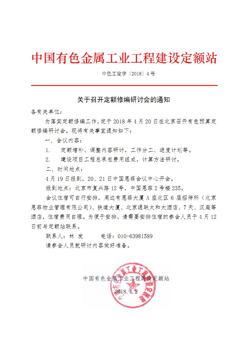 關(guān)于召開定額修編研討會(huì)的通知 中色工定字[2018] 4號(hào)