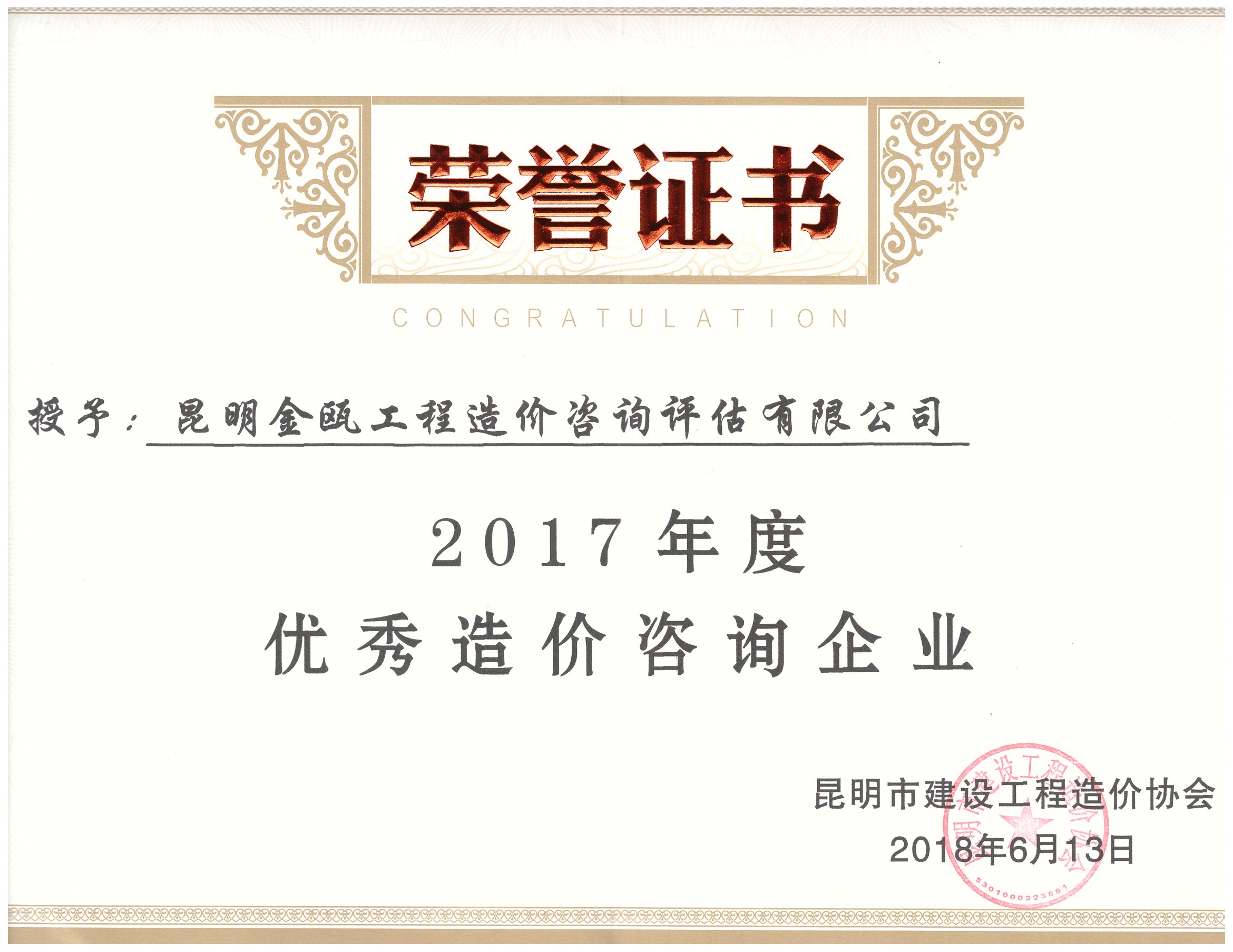 熱烈祝賀昆明金甌工程造價(jià)咨詢?cè)u(píng)估有限公司榮獲昆明市建設(shè)工程造價(jià)協(xié)會(huì)