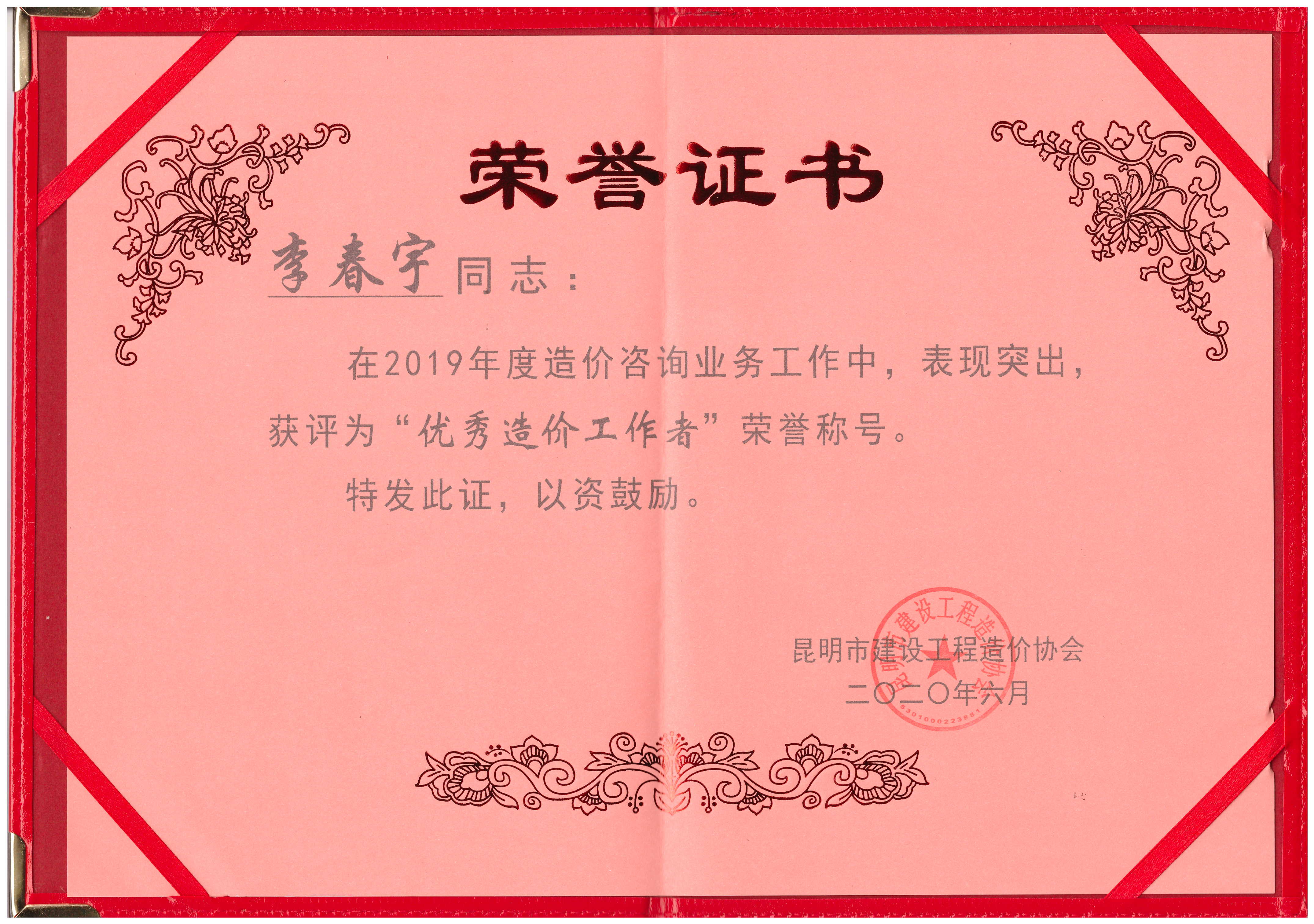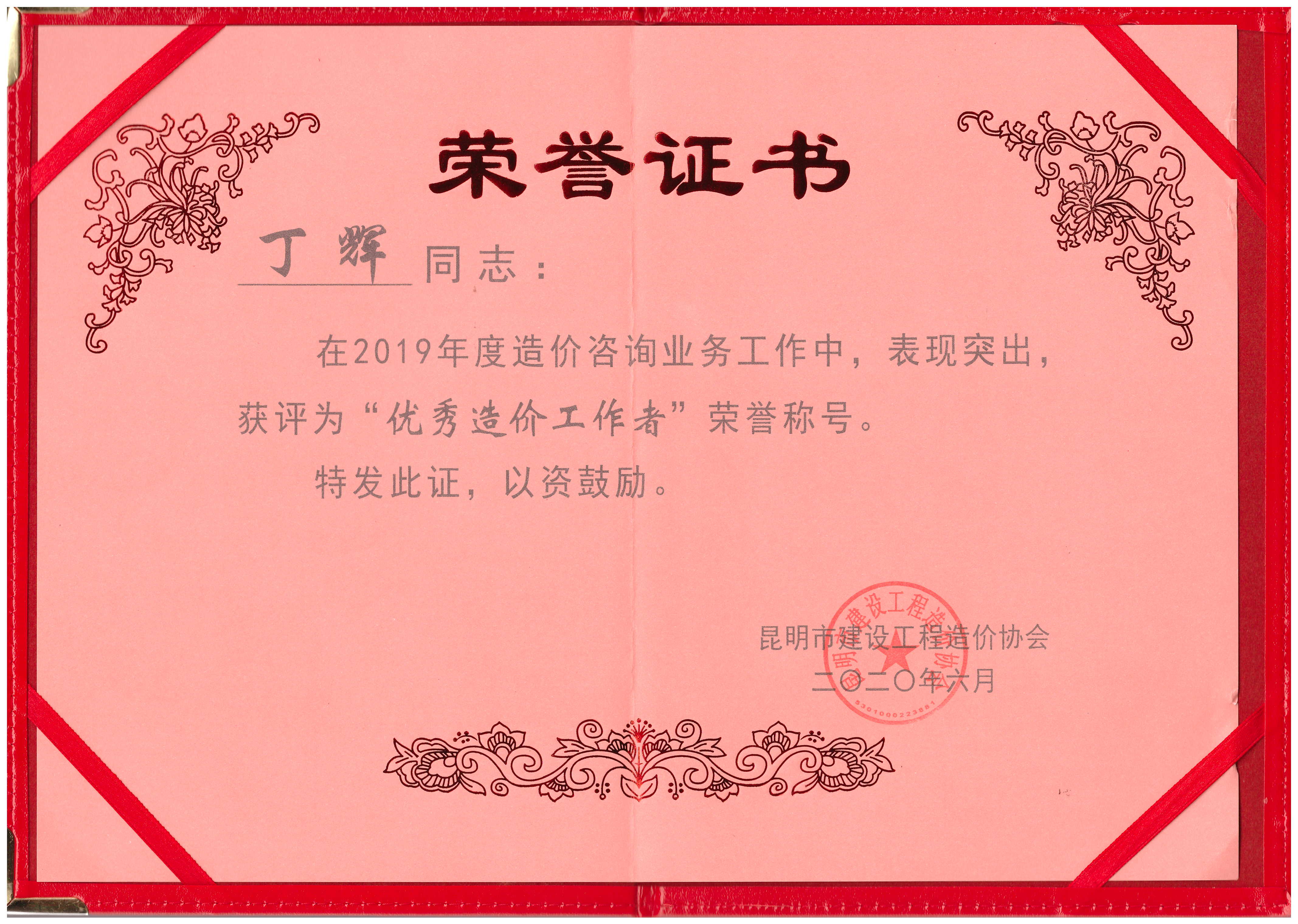 祝賀丁輝、李春宇同志榮獲2019年度“優(yōu)秀造價(jià)工作者”